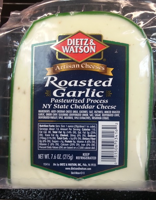 Ingredients: Aged cheddar cheese (milk, cultures, salt, enzymes), minced roasted garlic, onion chive seasoning (dehydrated onion, salt, sugar, dehydrated chive, dehydrated parsley, spice, dextrose, spice extractives, trisodium citrate.
