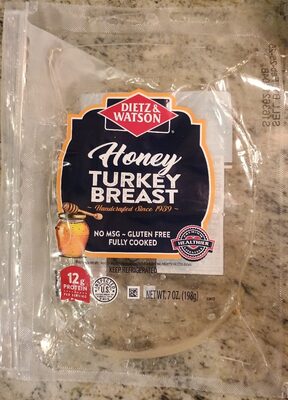 Ingredients: TURKEY BREAST, WATER, HONEY, CONTAINS LESS THAN 2% OF SEA SALT, POTASSIUM LACTATE, ORGANIC SUGAR, SODIUM PHOSPHATE MODIFIED CORN STARCH, POTASSIUM CHLORIDE, SODIUM DIACETATE, DEXTROSE, NATURAL SMOKE FLAVOR, SPICE EXTRACTS. BROWNED IN CANOLA OIL.
