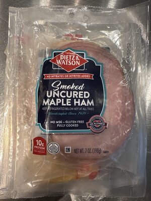 Ingredients: FRESH HAM, WATER, POTASSIUM LACTATE, CONTAINS LESS THAN 2% OF SEA SALT, MAPLE SYRUP, ORGANIC SUGAR, NATURAL FLAVORS, SODIUM PHOSPHATE, POTASSIUM CHLORIDE, DEXTROSE, SODIUM ASCORBATE (VITAMIN C), SPICE EXTRACTS, SODIUM DIACETATE, SODIUM NITRITE, NATURAL SMOKE FLAVOR.