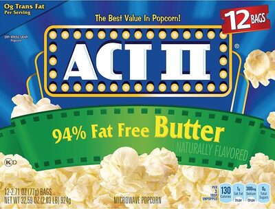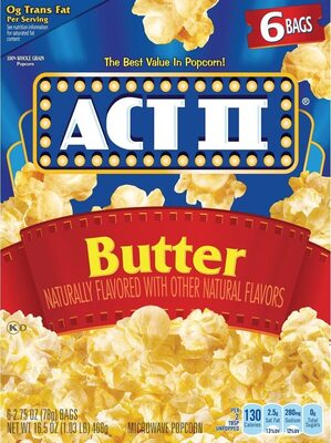 Ingredients: POPCORN, VEGETABLE OIL (CONTAINS ONE OR MORE OF THE FOLLOWING: COTTONSEED, CORN, CANOLA, SUNFLOWER, SAFFLOWER), SALT, NATURAL BUTTER FLAVOR, BETA CAROTENE (FOR COLOR).