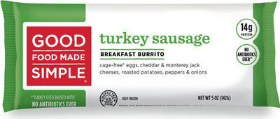 Ingredients: Flour tortilla (flour [wheat flour, whole wheat flour], water, palm oil, baking powder, sugar, salt, cellulose gum, guar gum, corn starch), cage-free* eggs (eggs, whole milk, corn starch, sea salt, pepper), turkey breakfast sausage (turkey thigh, water, salt, spices, sugar), white cheddar cheese sauce (water, whey, corn starch, whole milk powder, natural flavors, salt, cheddar cheese [cultured milk, salt, enzymes]), white cheddar cheese (pasteurized cultured milk, salt, enzymes), organic roasted russet potatoes (organic potatoes with organic olive oil), monterey jack cheese (pasteurized cultured milk, salt, enzymes), organic red peppers, organic green peppers, organic onions, corn starch.