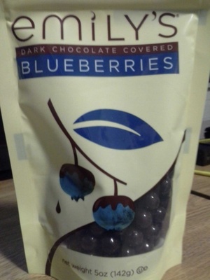 Ingredients: Dark chocolate (sugar, chocolate liquor, cocoa butter, milk fat, soy lecithin added as an emulsifier, and vanilla), dried blueberries (blueberries, sugar, natural flavor, citric acid, sunflower oil), corn syrup, tapioca dextrin, confectioner's glaze (refined lac.)