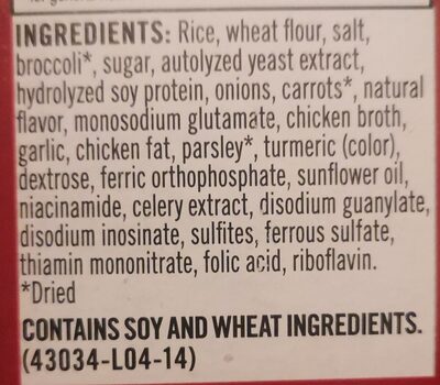 Ingredients: rice, wheat flour, salt, broccoli*, sugar, autolyzed yeast extract, hydrolyzed soy protein, onions, carrots*, natural flavor, monosodium glutamate, chicken broth, garlic, chicken fat, parsley*, turmeric (color), dextrose, ferric orthophosphate, sunflower oil, niacinamide, celery extract, disodium guanylate, disodium inosinate, sulfites, ferrous sulfate, thiamin mononitrate, folic acid, riboflavin. *dried contains soy and wheat ingredients.